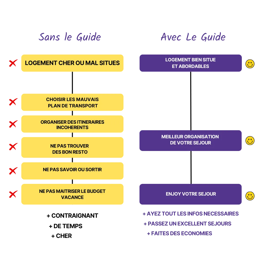 En échange, nous espérons recevoir vos avis et retours d'expérience, qui aideront d'autres voyageurs à mieux organiser leur séjour. Les fonds récoltés grâce à ce guide nous permettront également de l'améliorer et de continuer à offrir un service de qualité.